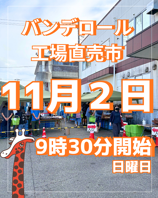 11月02日(日)朝9時30分~13時までバンデロール沼津本社工場にて「工場直売市」を開催します。